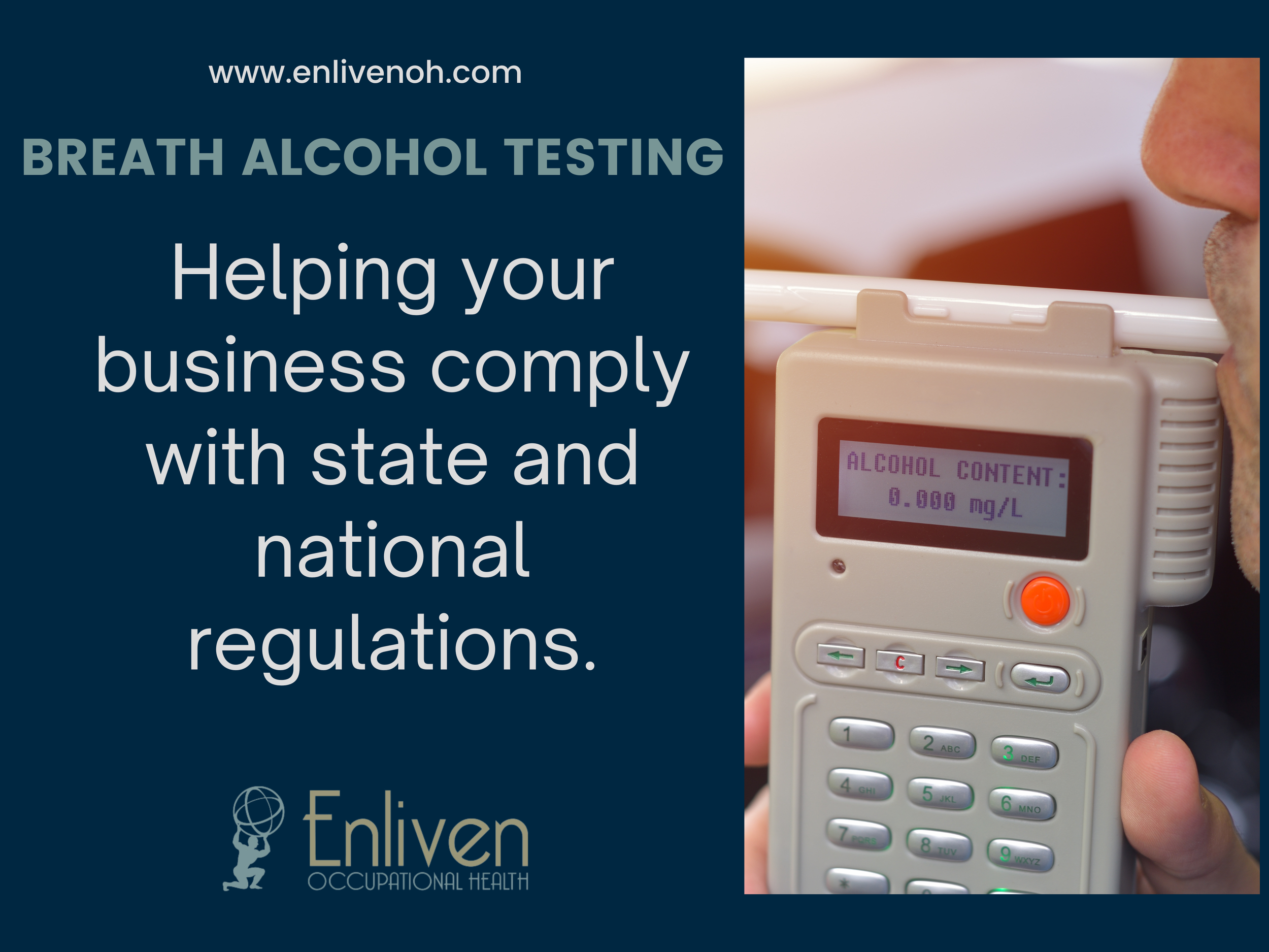 Let Enliven Occupational Health take the hassle of workplace alcohol testing. Our certified breath alcohol technicians (BAT) are ready to assist you with evidential breath alcohol tester for DOT and non-DOT alcohol testing.